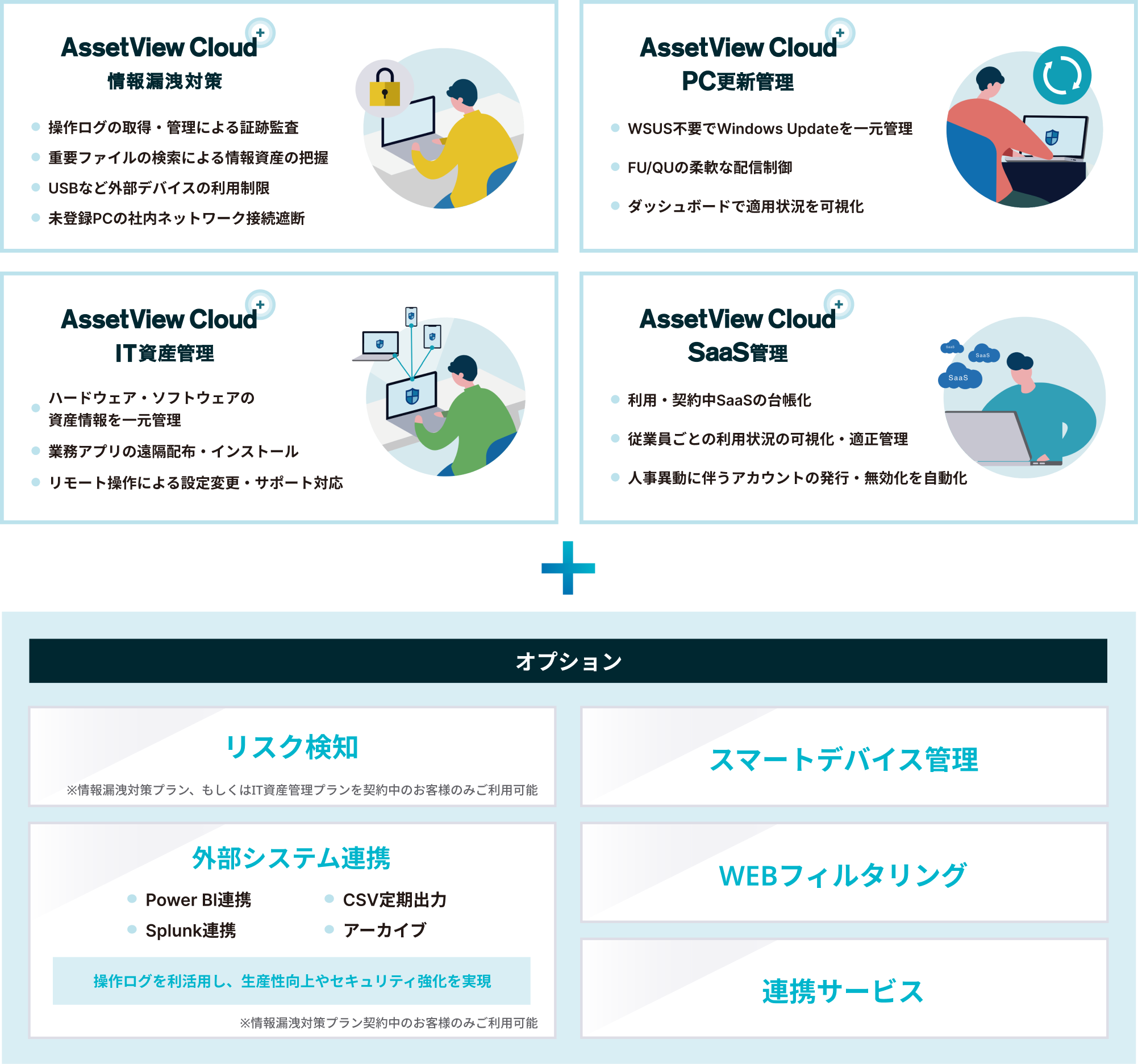 AssetView Cloud +は、情報システム担当者が管理・対策業務を最小限のリソースで効率的に実施できるよう、ヒトを起点とした新しい管理が実現できる運用管理ツールです。