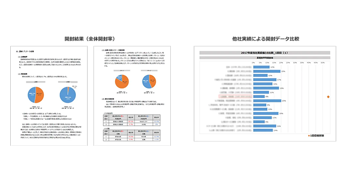 開封率(全体・所属別・役職別・パターン別)、他業種との比較データ、開封低減要因の分析など、豊富な視点で現状を把握できます。