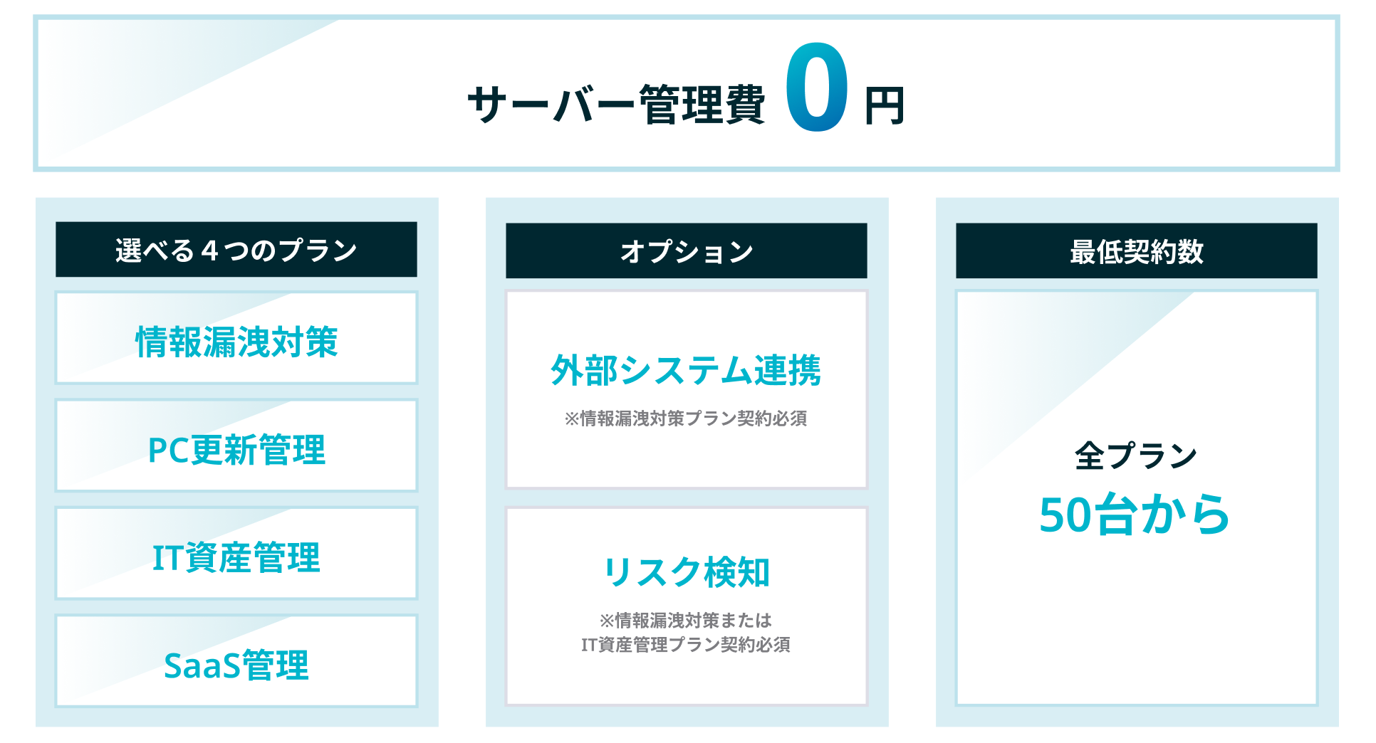 サーバー構築・管理が不要で、組み合わせ自由の4つのプランから必要なものだけ導入できるのでコストを抑えてご導入いただけます。