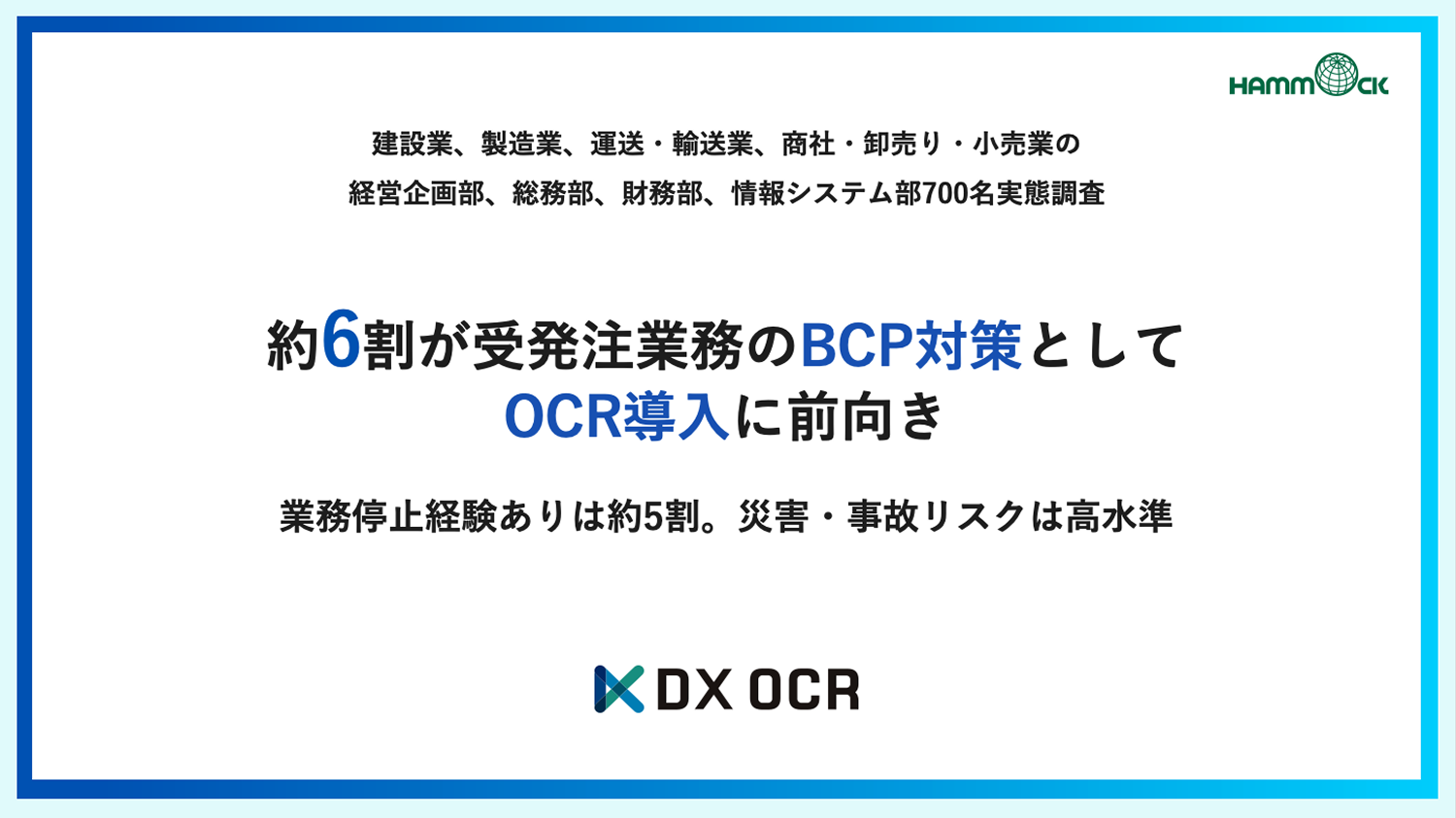 【受発注業務のBCP対策実態調査】約6割が受発注業務のBCP対策として OCR導入に前向き。業務停止経験ありは約5割。災害・事故リスクは高水準。