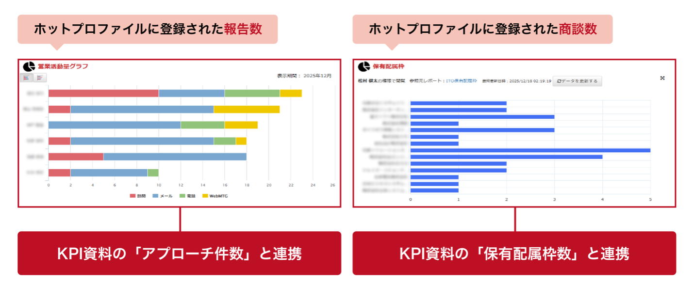 「営業アウトソーシング事業が外部向けに公開しているKPIを、ホットプロファイルの報告管理・商談管理と連動させて運用しています。たとえば『アプローチ件数』は、ホットプロファイルに報告を1件登録=1アプローチとして管理し、目標に対する達成度を判断できる仕組みです。さらにレポート機能でアプローチ数や配属枠数をグラフ化しており、そのままKPI資料にも転用でき、集計作業にかかる運用負荷の大幅な軽減につながっています」(松村氏)