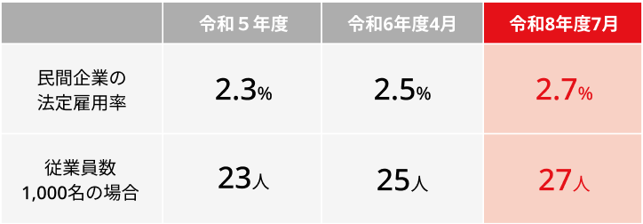 障がい者の雇用は法的に義務付けられているだけでなく、企業の社会的責任(CSR)として多様性のある持続的な社会の実現に向けて積極的に取り組まなければなりません。2024年4月の改正では法定雇用率が2.5%となっており、2026年7月から2.7%に引き上げられます。厚生労働省による法定雇用率の段階的引き上げや除外率の引き下げは、社会的要請の高まりを明確に示しています。