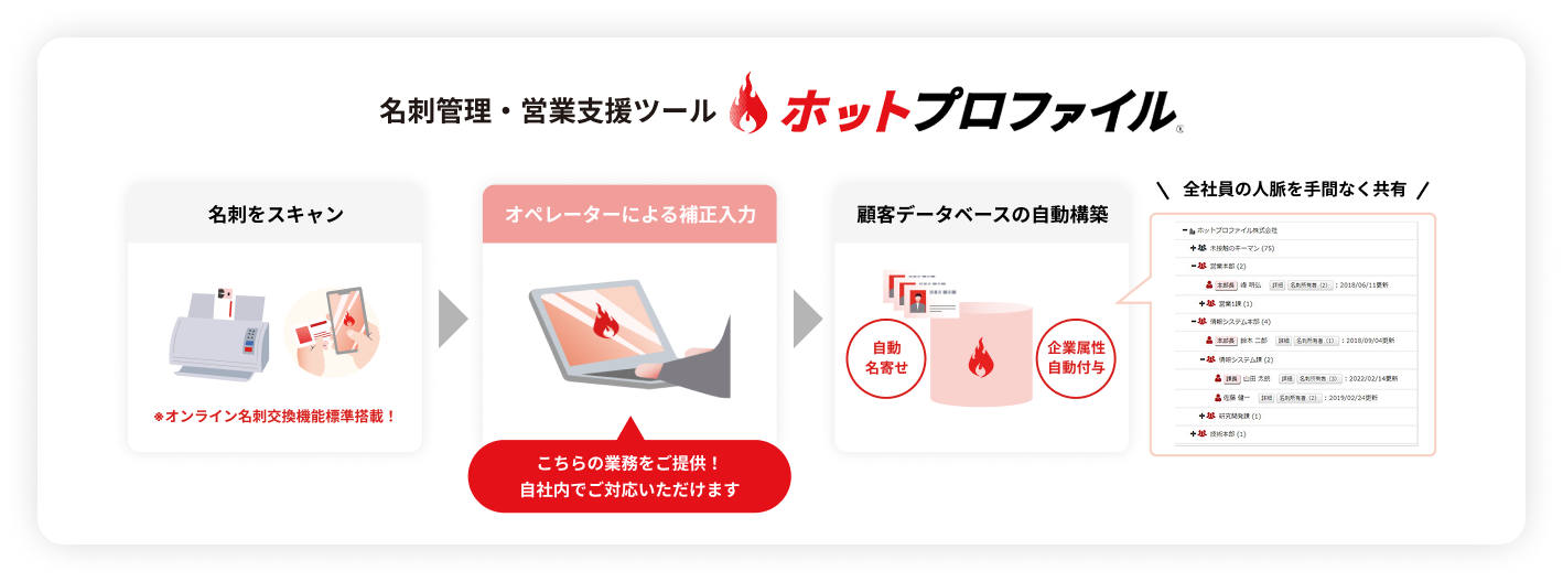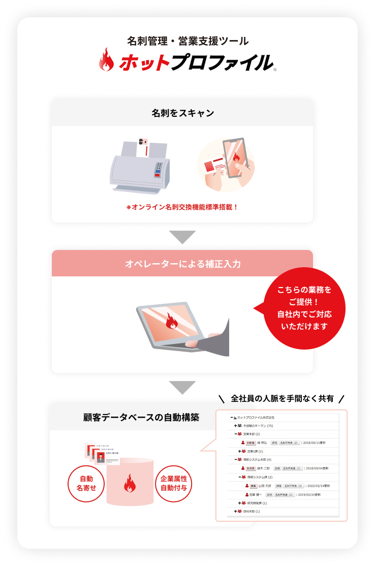 セキュリティを強化名刺入力業務を外部委託をせずに自社内で完結することで、セキュリティ強化を実現します。