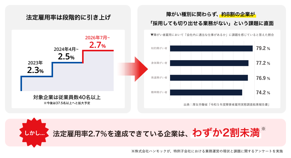 障がい者の雇用は、法的義務にとどまらず、ダイバーシティを重視する企業経営において重要性が高まっています。法定雇用率は2024年4月に2.5%へ引き上げられ、2026年7月には2.7%となる予定です。一方で、多くの企業が「適当な仕事がない」という課題を抱えています。