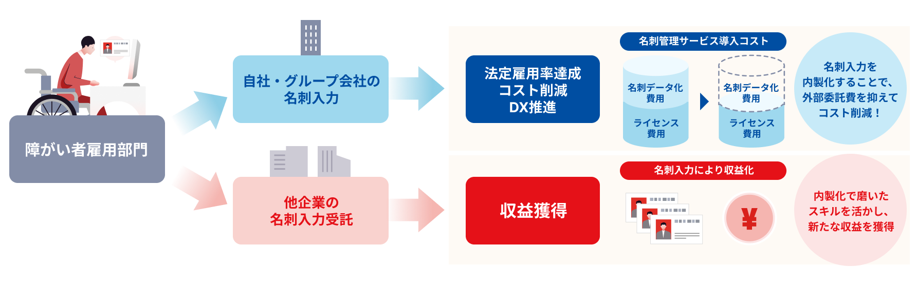 名刺データ化の『内製化』と『受託業務』により、法定雇用率達成と収益獲得を両立します。