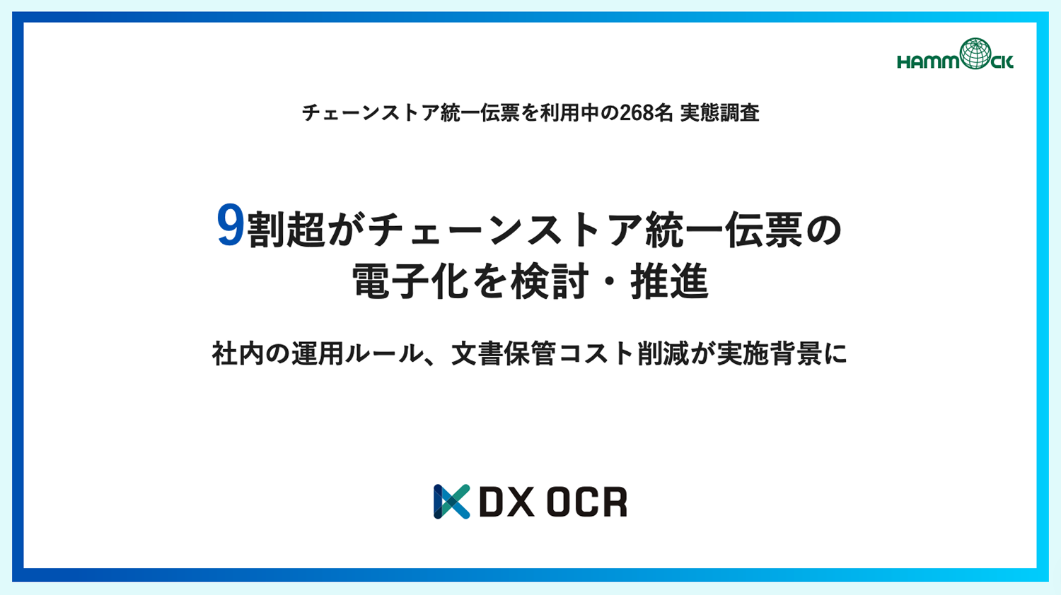 株式会社ハンモック(本社:東京都新宿区、代表取締役社長:若山 大典、証券コード:173A、以下「ハンモック」)は、チェーンストア統一伝票を利用中の268名を対象に「チェーンストア統一伝票のDX推進に関する実態調査」を実施しました。